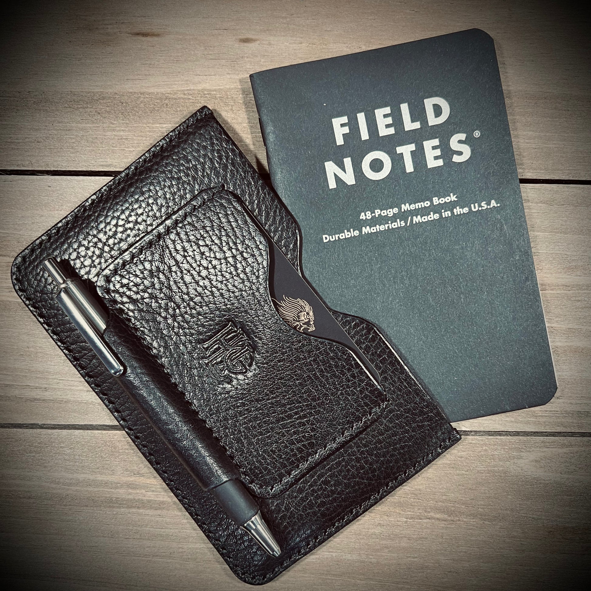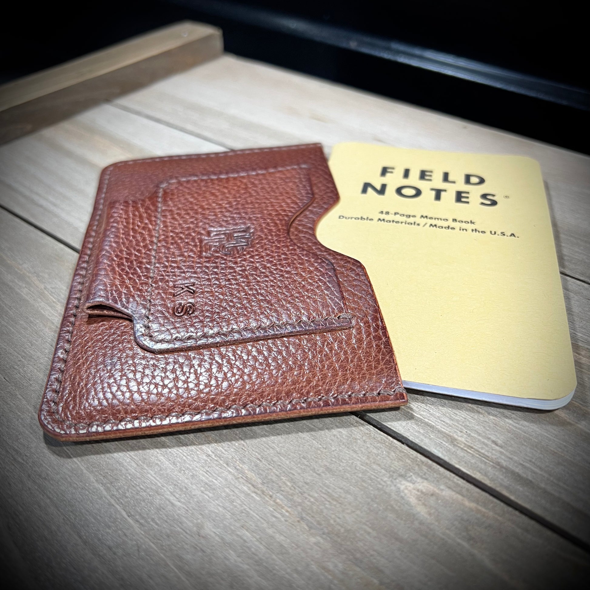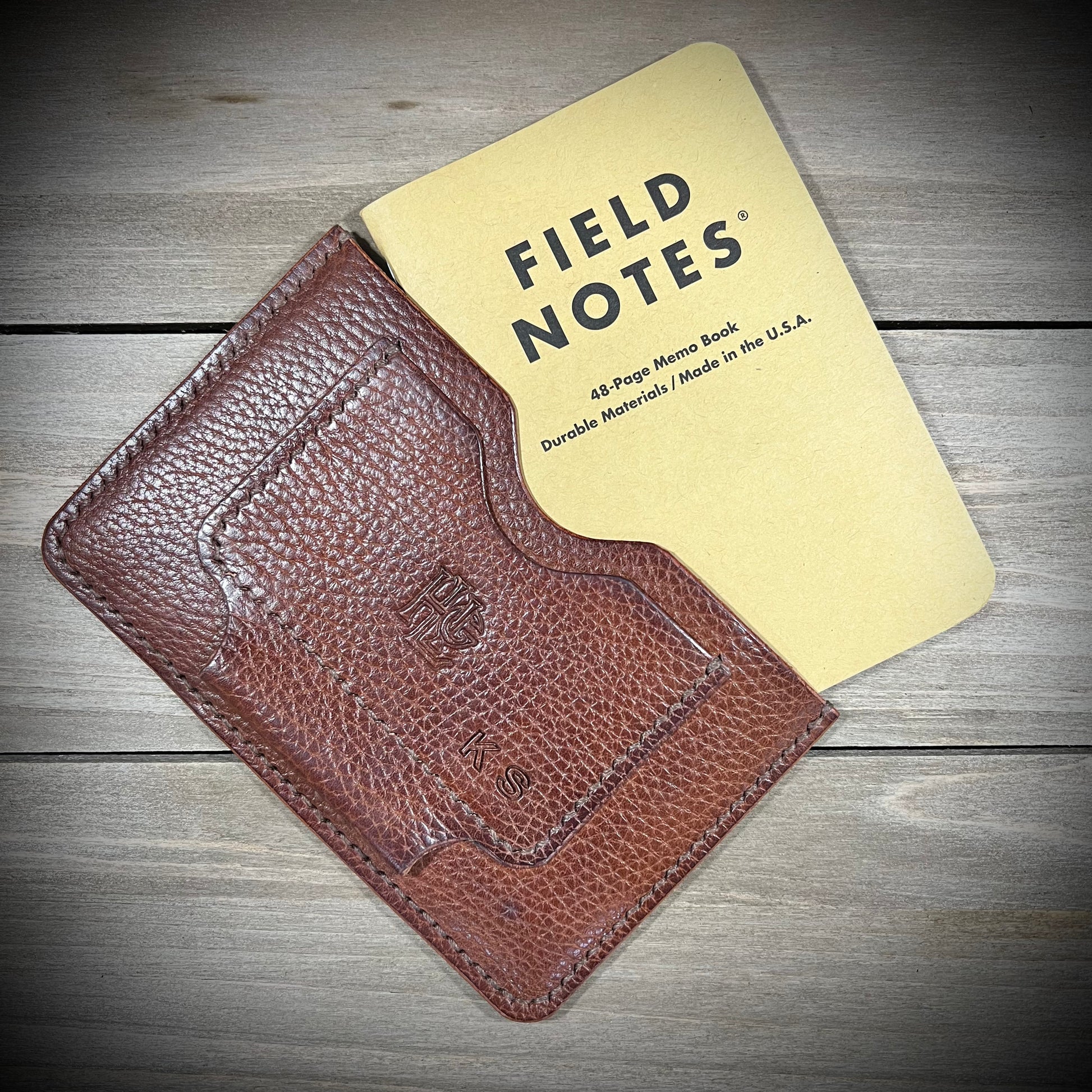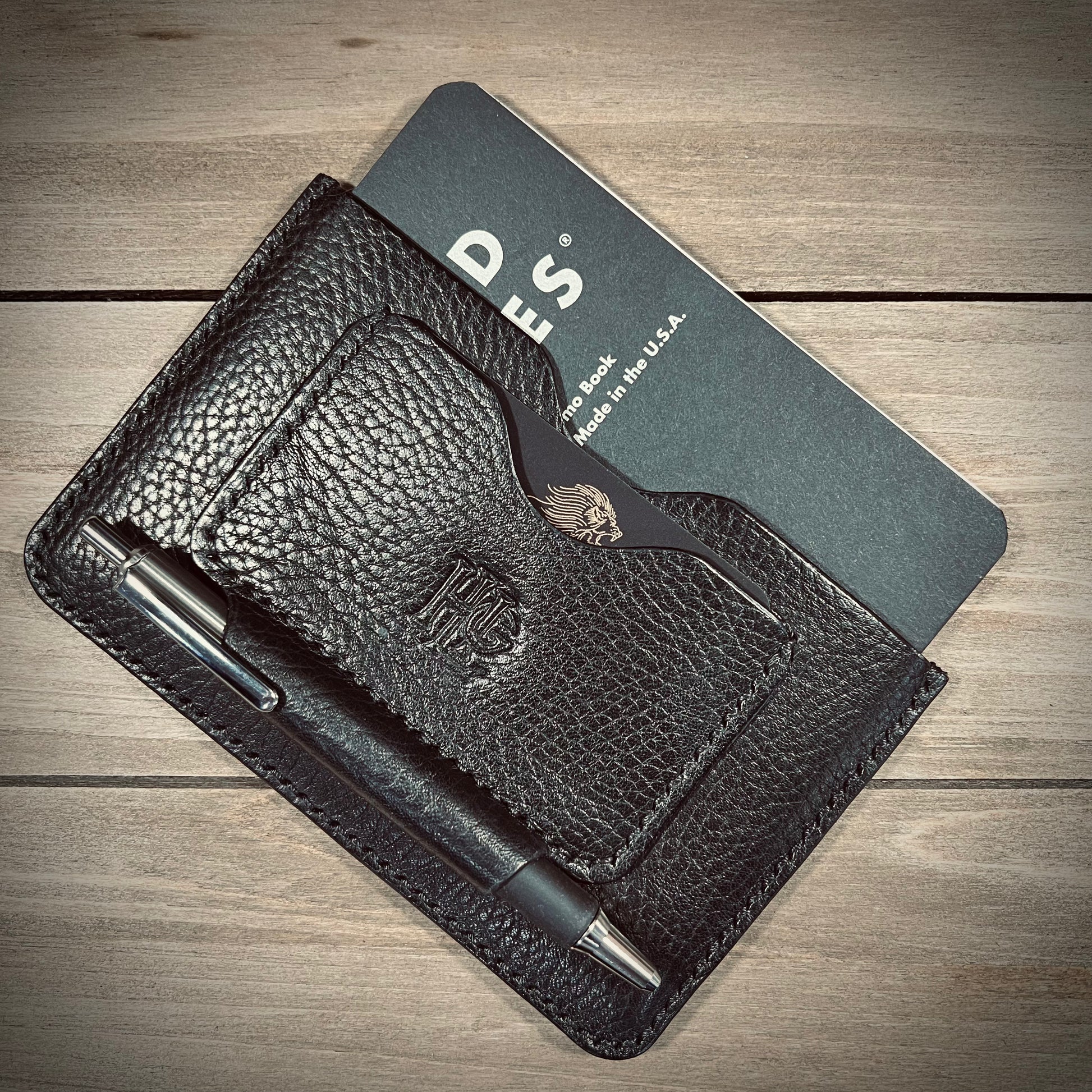 This is the Journalist. Made from the finest of milled leathers. It is super slim and perfect for on the go documenting/journaling. Fits most pens and has a slot for business cards/credit cards. Holds small fields notes and small moleskin notebooks.