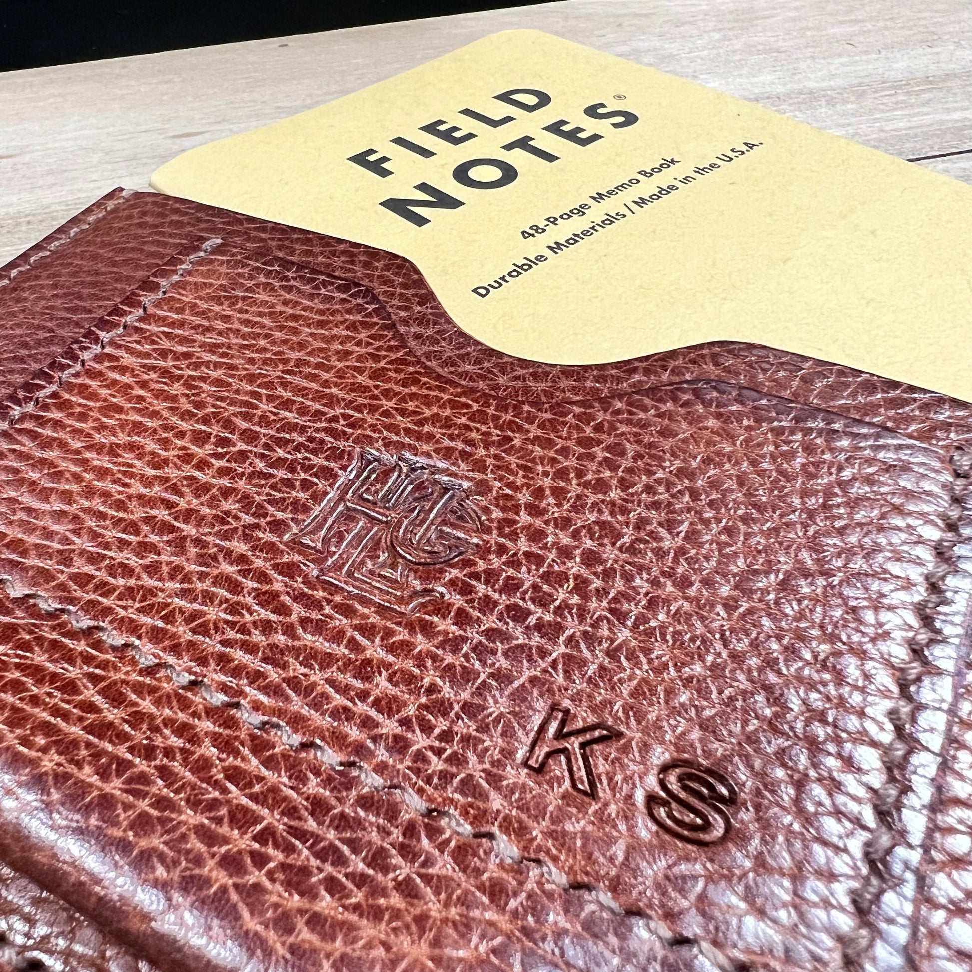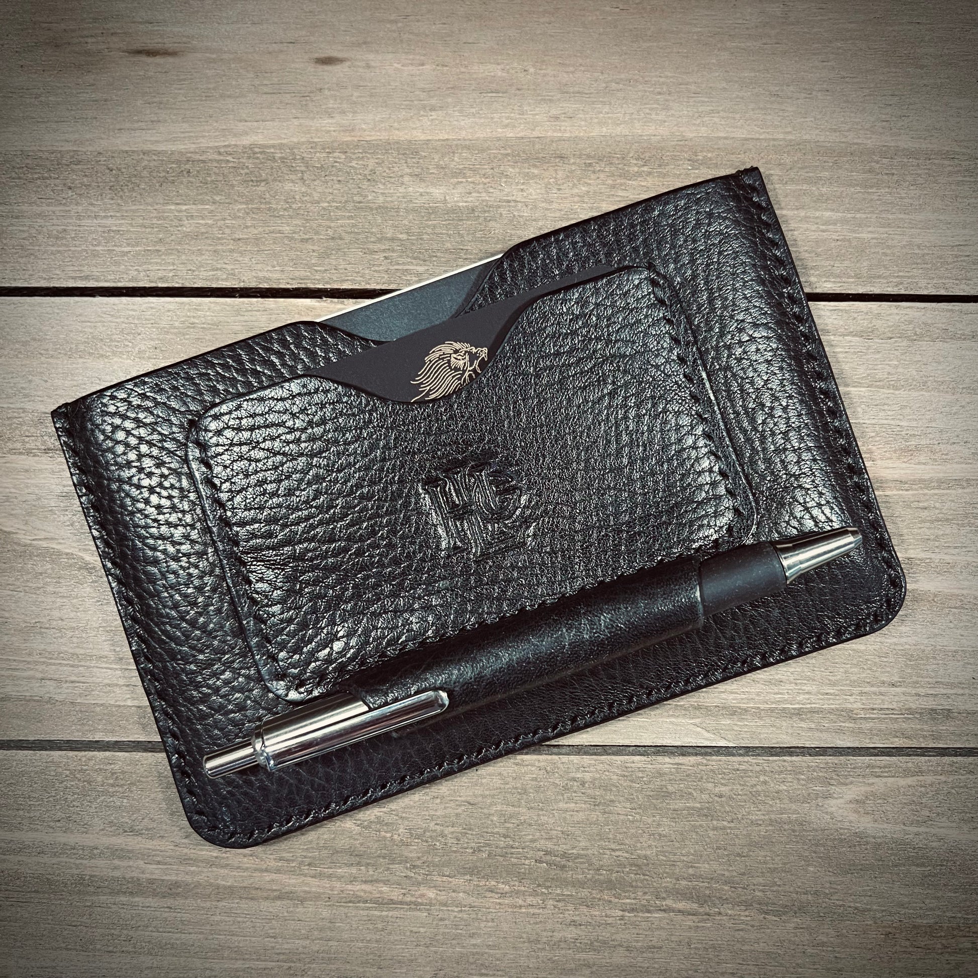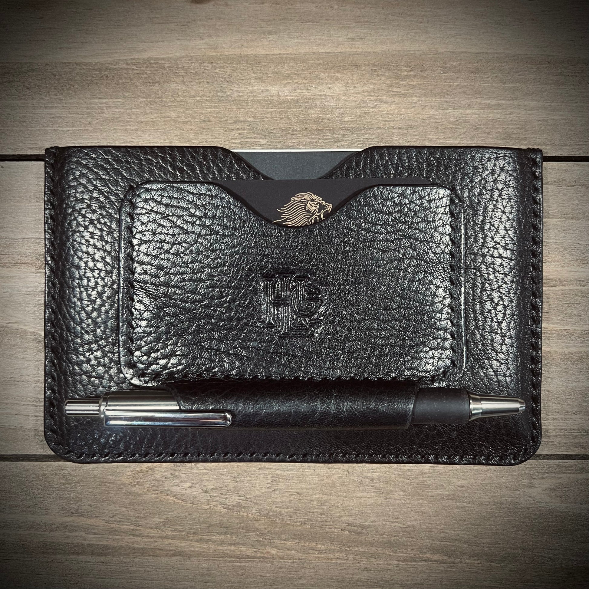 This is the Journalist. Made from the finest of milled leathers. It is super slim and perfect for on the go documenting/journaling. Fits most pens and has a slot for business cards/credit cards. Holds small fields notes and small moleskin notebooks.