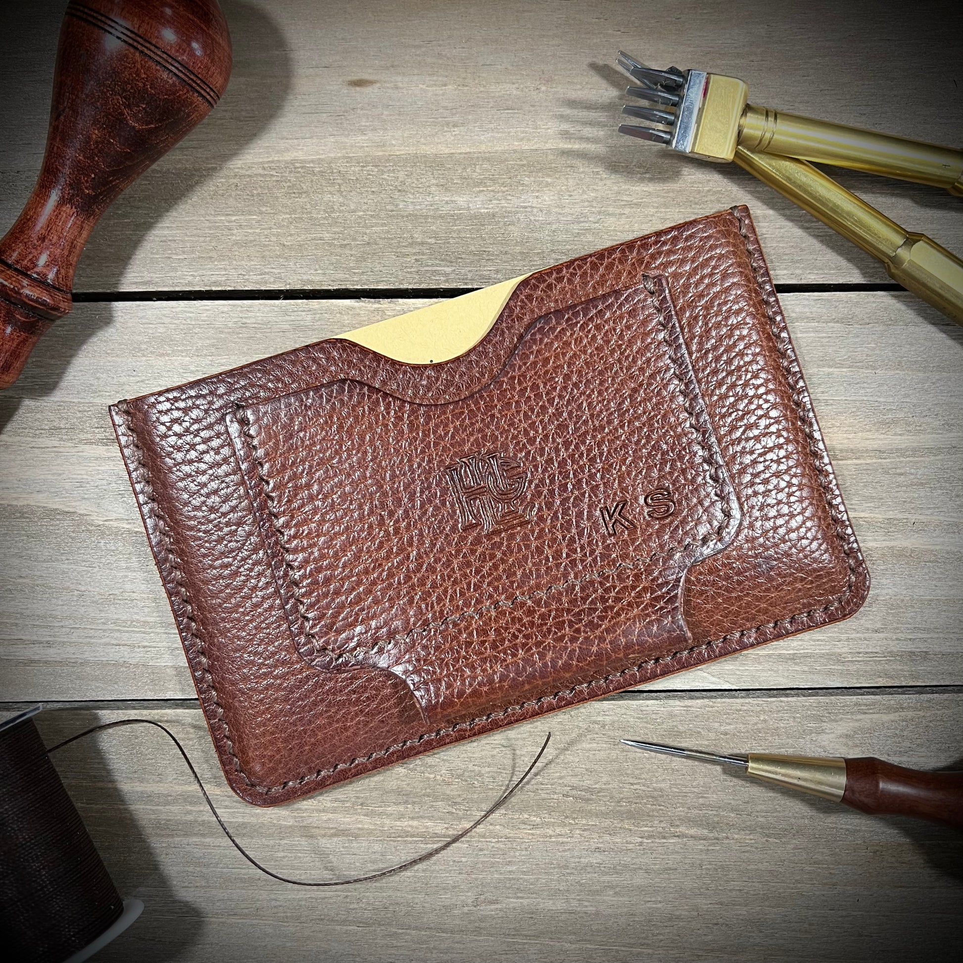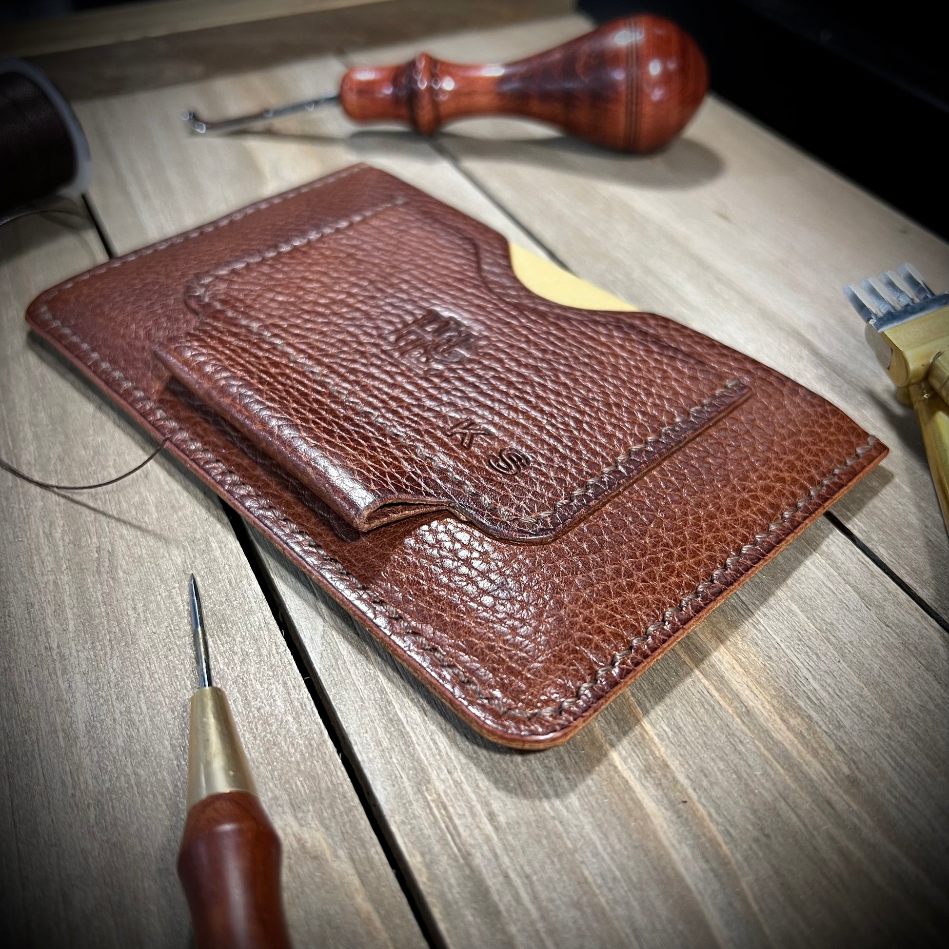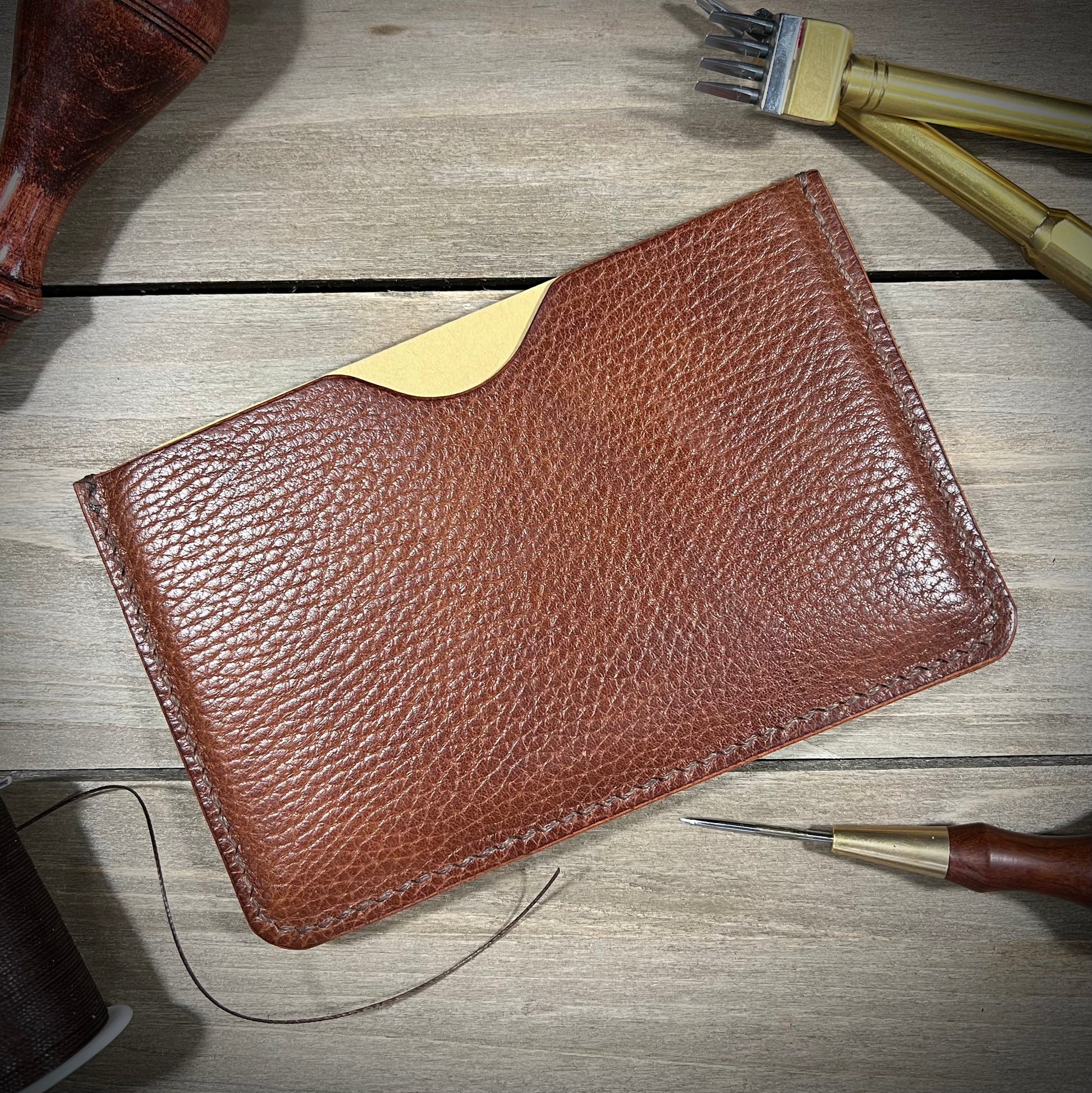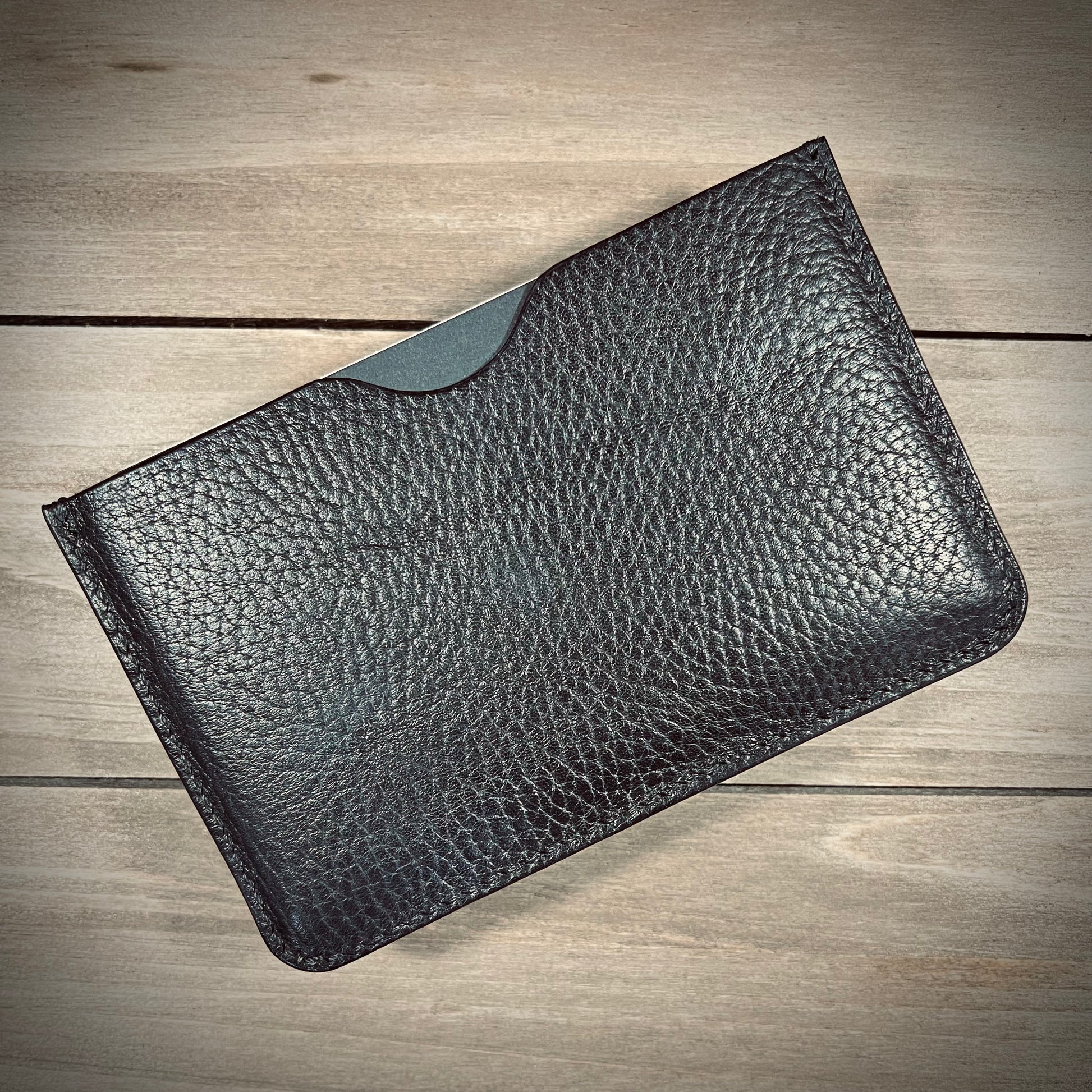 This is the Journalist. Made from the finest of milled leathers. It is super slim and perfect for on the go documenting/journaling. Fits most pens and has a slot for business cards/credit cards. Holds small fields notes and small moleskin notebooks.