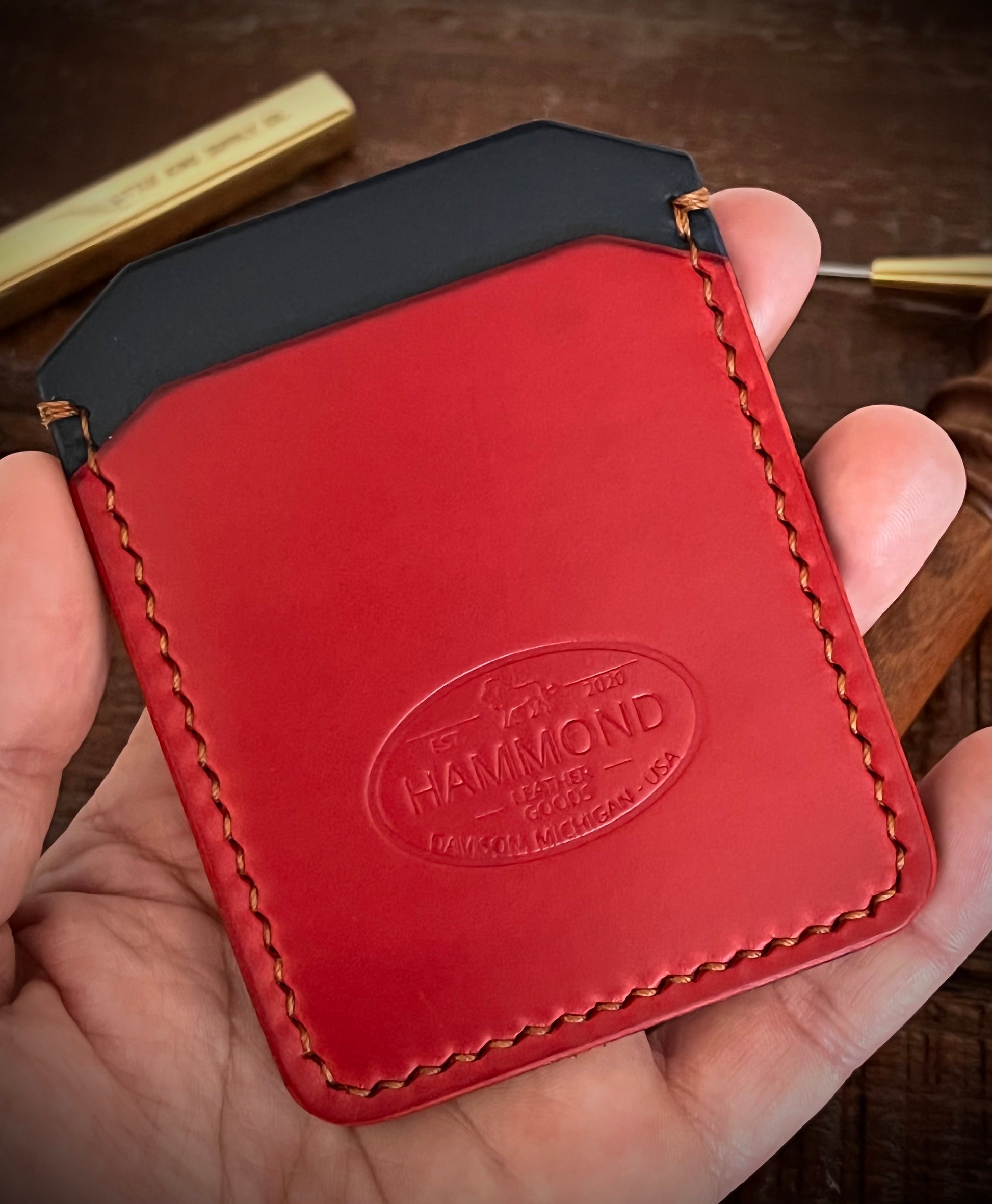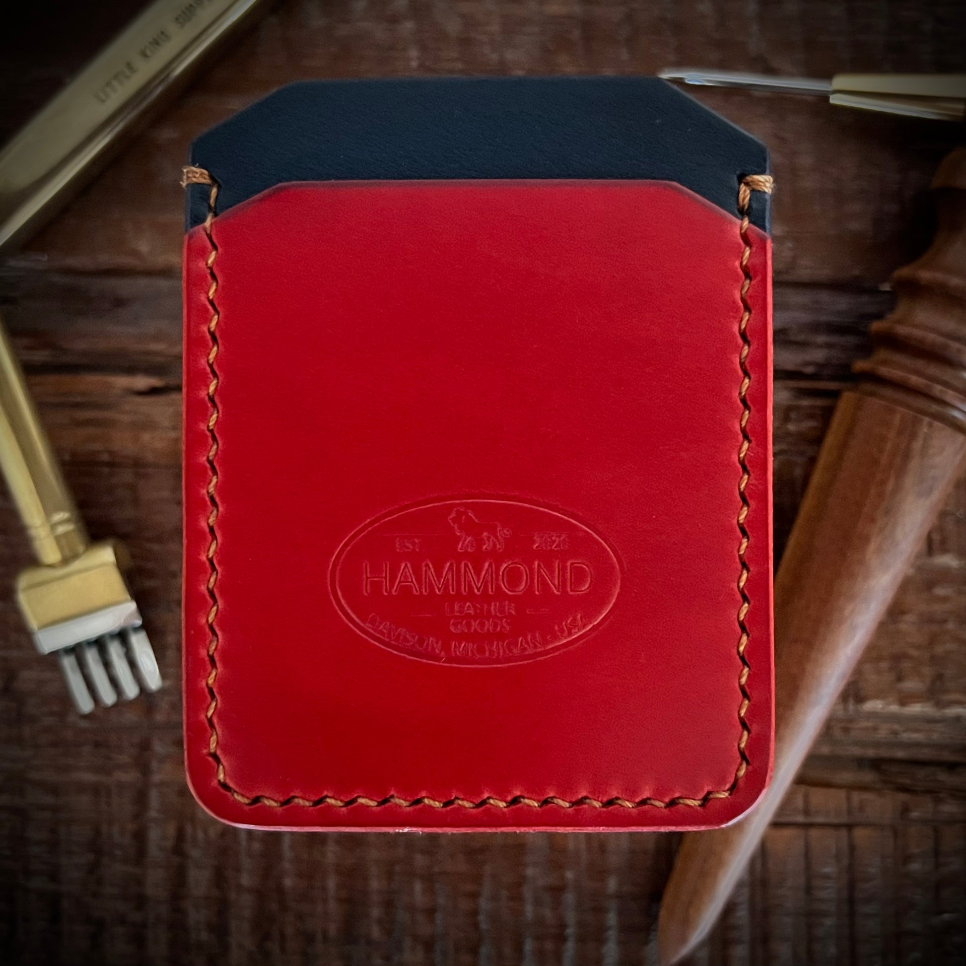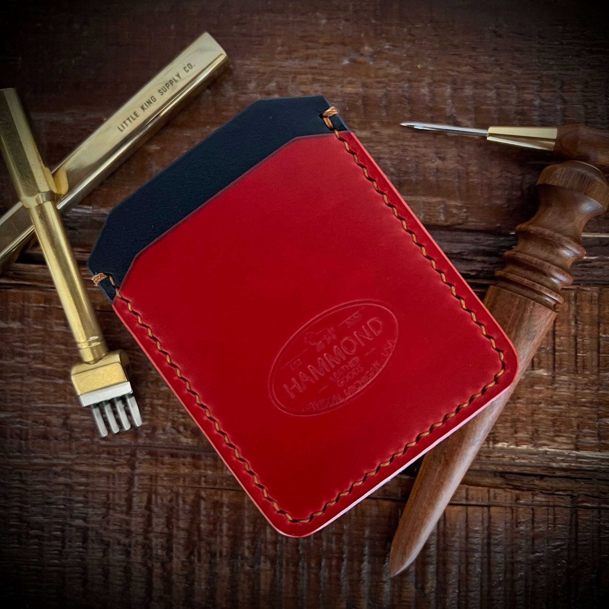 - Navy English Bridle Leather by Wickett & Craig (USA), Paired with beautiful red Buttero Italian Leather